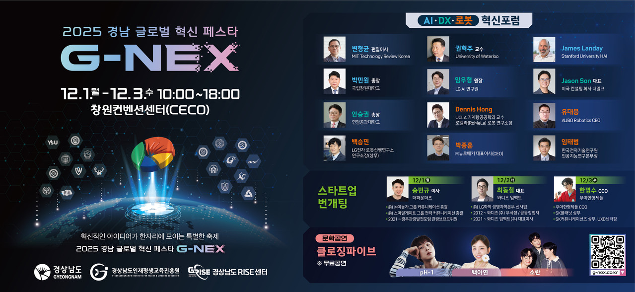 1. 경상남도와 경상남도인재평생교육진흥원은 첨단 산업 분야를 선도하기 위한 「2025 경남 글로벌 혁신 페스타(G-NEX)」를 아래와 같이 개최하오니 많은 관심과 참여 바랍니다.