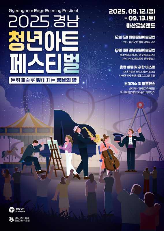 ■ 2025 경남청년아트페스티벌이 '문화예술로 깊어지는 경남의 밤'을 주제로 오는 9월12일(금)~9월 13일 (토)까지 2일간 마산로봇랜드에서 개최하오니, 많은 관심 바랍니다.