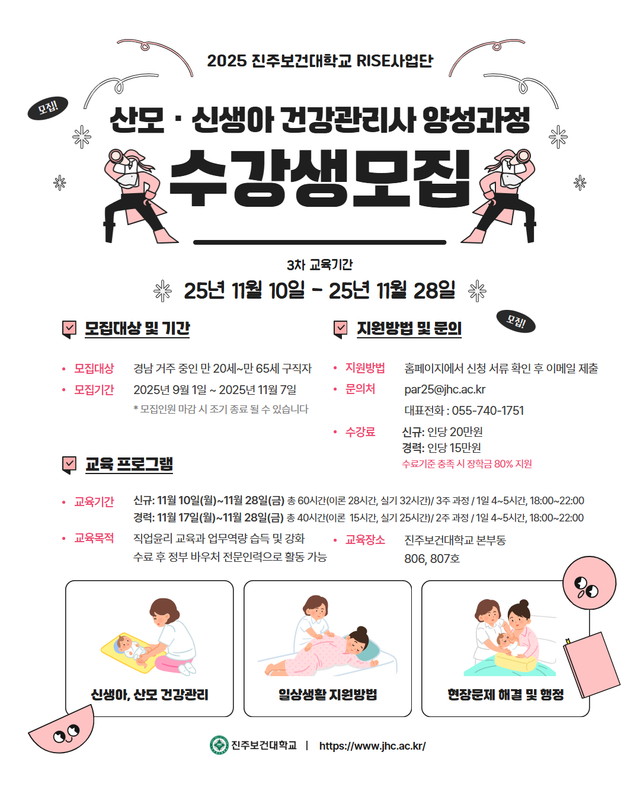 진주보건대학교 RISE사업단에서 2025년 산모·신생아 건강관리사 양성과정에 참여할 교육생을 모집합니다.